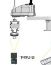 机械手抓取物料后移动到下相机拍照位置拍照,计算放料误差,然后去放料点放置物料。